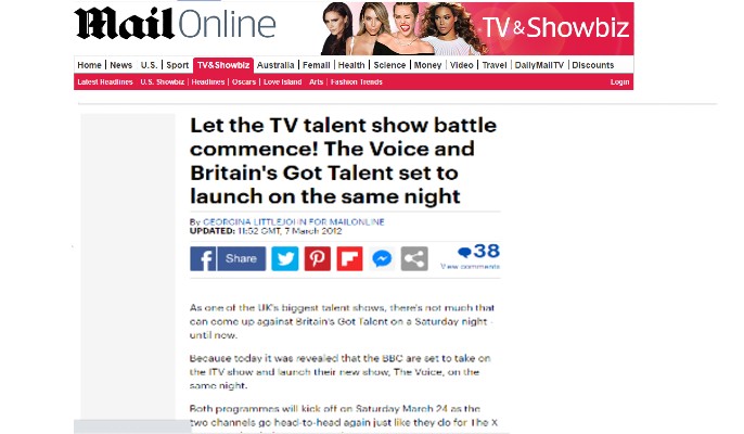 El éxito histórico de la BBC molesta a otros conglomerados privados con aspiraciones como News Corporation que consideran que la titularidad pública de un medio hace que el resto compitan en desigualdad de condiciones. Y no hablemos de casos de entetenimiento como el de la batalla que libraron en 2012 la BBC y ITV por los derechos de La Voz en Reino Unido. Murdoch duda del sentido que tiene que la BBC emita La Voz gastándose 22 millones de libras en la licencia obligando a competir a la privada ITV con Britain´s Got Talent en la misma franja. Adjunto imagen del Daily Mail, diario de Murdoch.