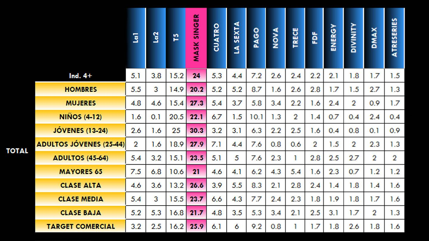 Los directivos de las cadenas en España arriesgan menos al adquirir formatos que ya han funcionado en otros mercados. No es lo mismo producir una idea que te trajo tu primo de Cuenca en un powerpoint que un formato que funcionó en 39 países. Mira estos datos de un día de MASK SINGER en España