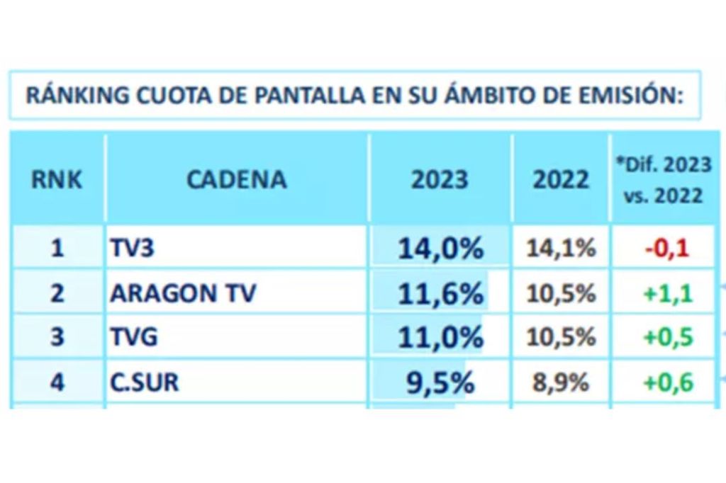Un caso de estudio: a las autonómicas y a TVE les ha ido bien en 2023. TV3 se ha mantenido en un contexto muy competitivo para ellas. además tvg, Canal Sur, Aragon Tv, Tv Canarias y Televisión de Extremadura han incrementado su audiencia con respecto a 2022